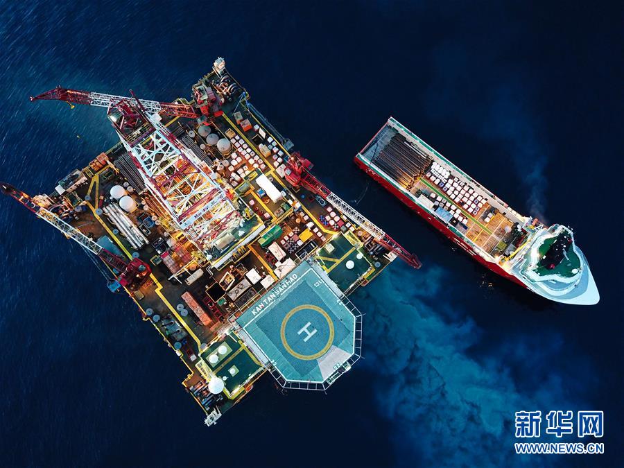 這是7月29日拍攝的正在南海北部海域進行鉆探作業(yè)的勘探三號鉆井平臺和為其運送物資的拖船(無人機照片)。新華社記者蒲曉旭攝