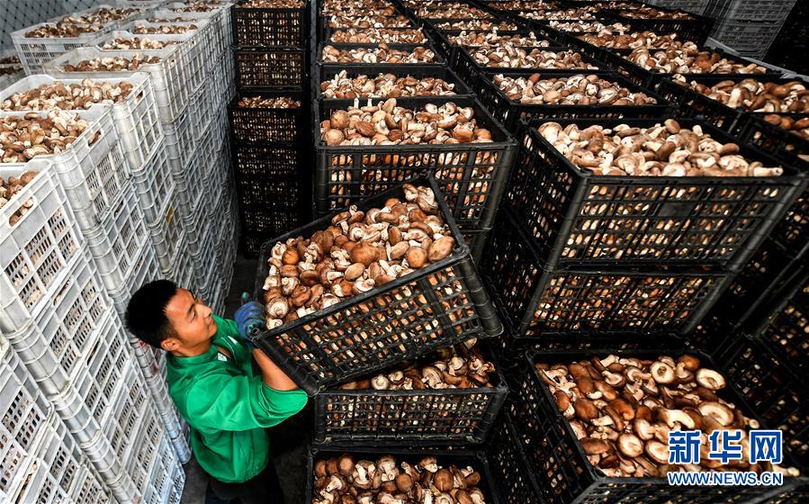 陜西漢中市留壩縣武官驛鎮(zhèn)留香益品商貿(mào)公司的員工在擺放冷庫(kù)里的香菇(7月2日攝)。陜西留壩縣是陜西西南部的特色農(nóng)業(yè)產(chǎn)業(yè)縣,近年來在推進(jìn)產(chǎn)業(yè)富民的過程中,開辟出一條“政府+龍頭企業(yè)+扶貧社+農(nóng)戶”的訂單產(chǎn)業(yè)發(fā)展道路,把農(nóng)戶綁在產(chǎn)業(yè)鏈上,持續(xù)帶動(dòng)農(nóng)業(yè)增效、農(nóng)民增收。新華社記者劉瀟攝。