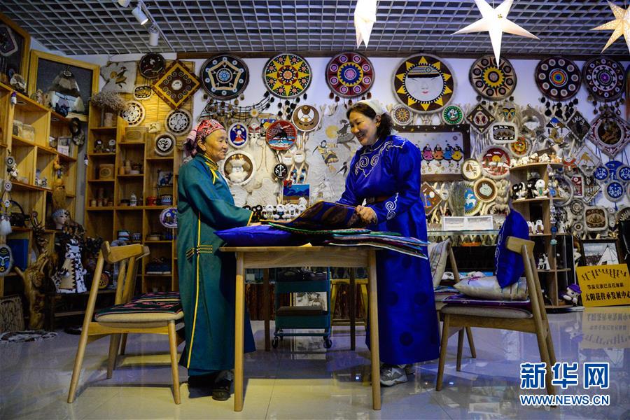 在內(nèi)蒙古自治區(qū)鄂溫克族自治旗巴彥托海鎮(zhèn)太陽花傳承發(fā)展中心,脫貧戶敖登圖雅(左)向?yàn)跞式桓蹲约褐谱骱玫氖止に嚻罚?月6日攝)。新華社記者徐欽攝。