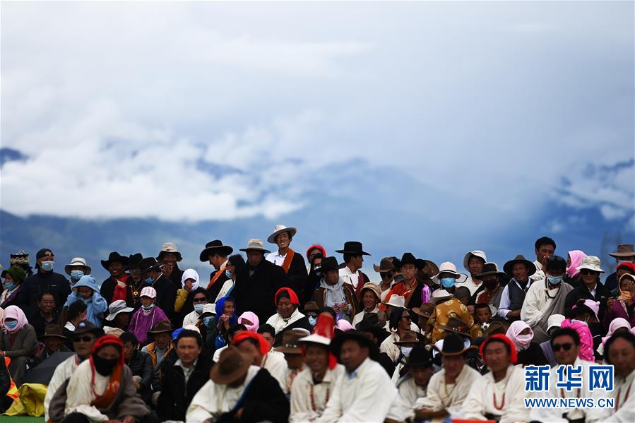 8月10日,牧民在拔河比賽現場觀看比賽。新華社記者普布扎西攝。
