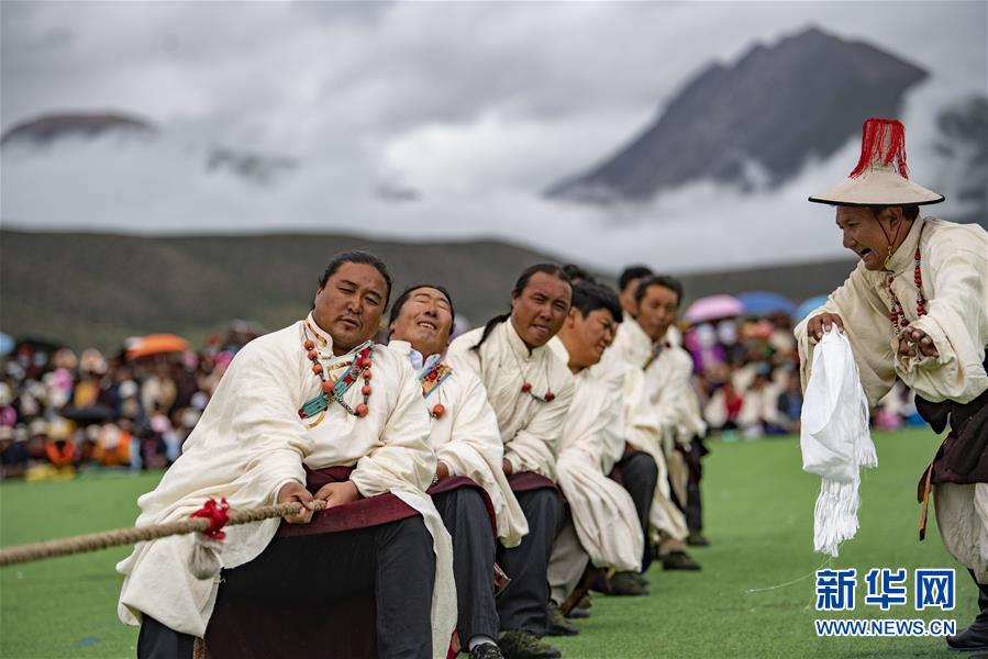 8月10日,當雄縣牧民在拔河比賽中。新華社記者晉美多吉攝。