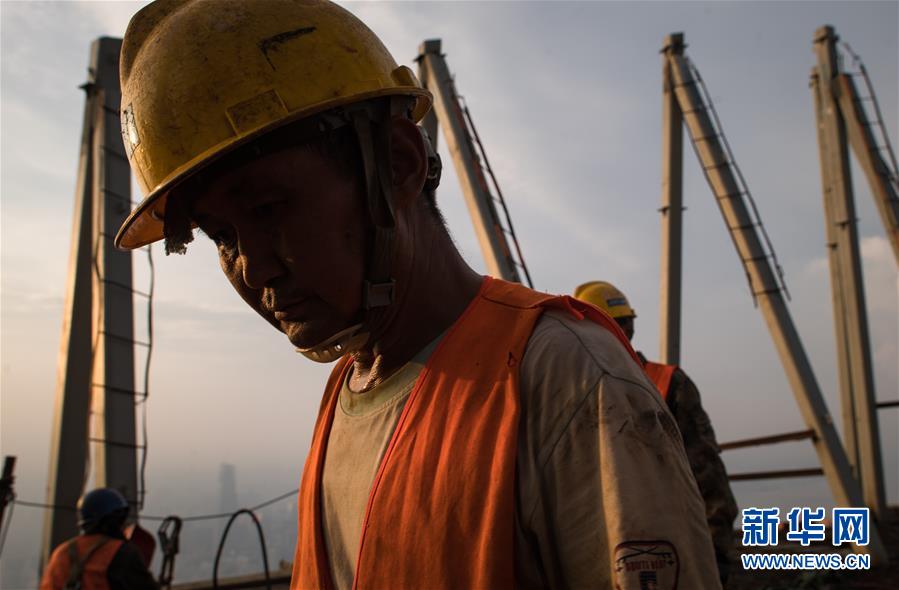 8月11日,工人在武漢綠地中心項(xiàng)目建設(shè)現(xiàn)場近500米的高空施工。新華社記者肖藝九攝
