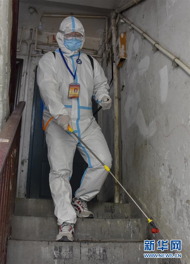 8月12日,烏魯木齊市天山區(qū)山西巷社區(qū)工作人員王志鷹在對居民樓道進行消毒。新華社記者 高晗
