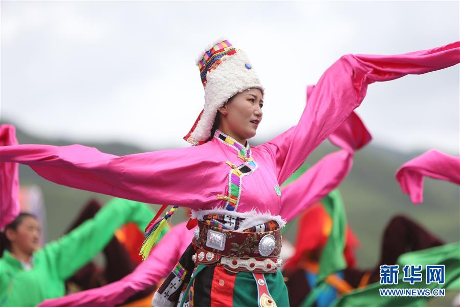 8月12日,演員在開幕式上表演舞蹈。當(dāng)日,2020中國(guó)碌曲鍋莊舞展演暨甘南藏族自治州第六屆少數(shù)民族傳統(tǒng)體育運(yùn)動(dòng)會(huì)在甘肅省甘南州碌曲縣夏澤灘草原上舉行。開幕式上,三千余名身著節(jié)日盛裝的演員和當(dāng)?shù)厝罕娫诓菰掀鹞?,雨后初晴的草原上充滿歡聲笑語(yǔ)。新華社記者 耿馨寧 攝
