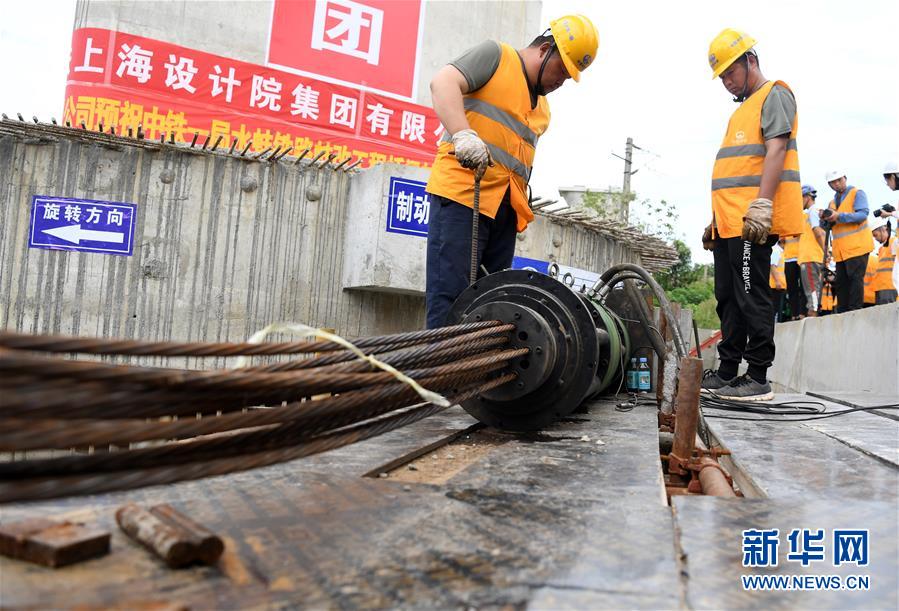 8月12日,中鐵一局施工人員在轉(zhuǎn)體梁轉(zhuǎn)體施工現(xiàn)場(chǎng)作業(yè)。新華社記者 劉軍喜 攝
