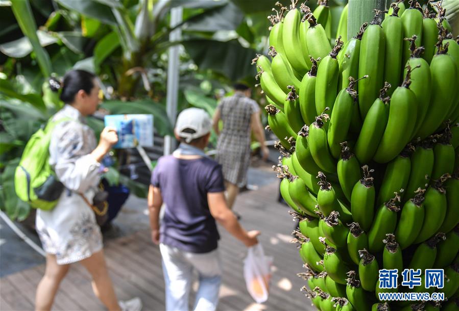在吉林省永吉縣萬昌鎮(zhèn)宇豐紅果木瓜產(chǎn)業(yè)園,游客與大棚內(nèi)的香蕉合影留念(8月12日攝)。新華社記者 許暢 攝
