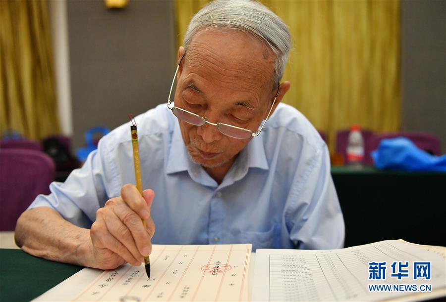 8月13日,陜西師范大學(xué)退休教師符有堂書寫錄取通知書。當(dāng)日,陜西師范大學(xué)2020年手寫錄取通知書正式開筆。該校自2007年起采用毛筆書寫錄取通知書的方式,為新生傳遞佳音。今年,學(xué)校十余位退休教師、在職教師、校友代表等書法愛好者將為約4500名新錄取的本科生送上帶著墨香的大學(xué)錄取通知書。新華社記者張博文攝
