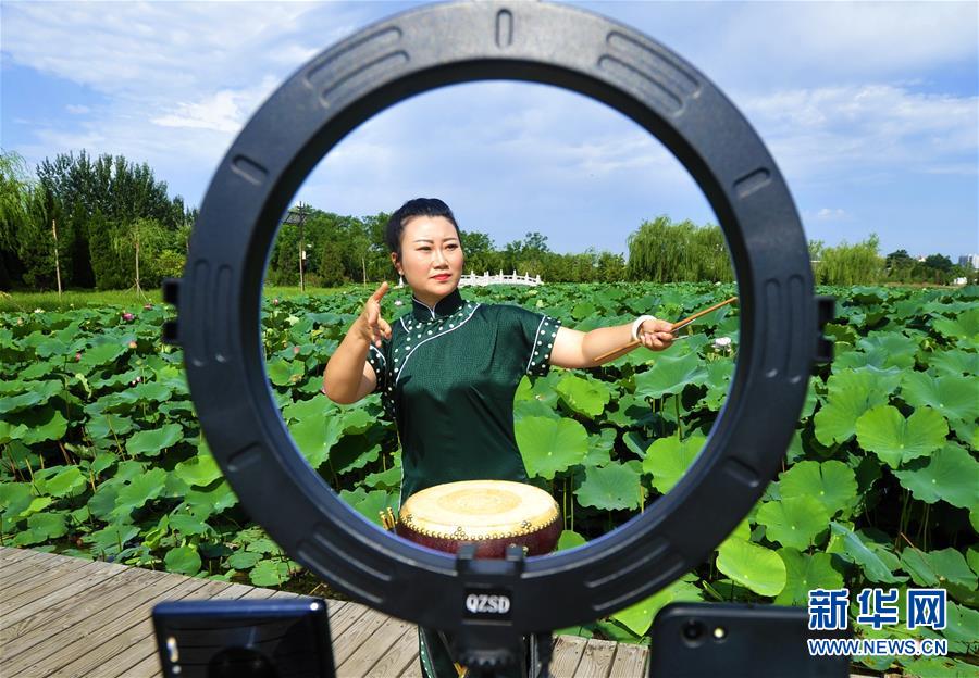 8月13日,河北省河間市西河大鼓非遺項目藝人李雪通過網(wǎng)絡直播表演西河大鼓。暑假期間,河北省河間市文化館推出非遺展演“云端”播系列活動,組織當?shù)匚骱哟蠊姆沁z項目傳承人利用視頻直播的方式進行線上展演,通過“云端”傳承非遺文化。新華社記者朱旭東攝