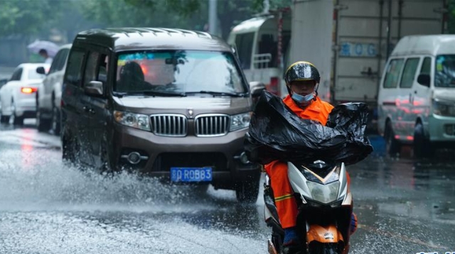 北京市大興區(qū)亦莊鎮(zhèn),市民冒雨出行。