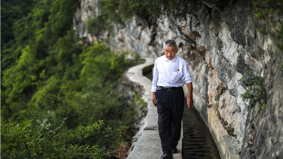 貴州遵義播州區(qū)團結村老支書黃大發(fā)沿著修建在絕壁上的“大發(fā)渠”巡查。
