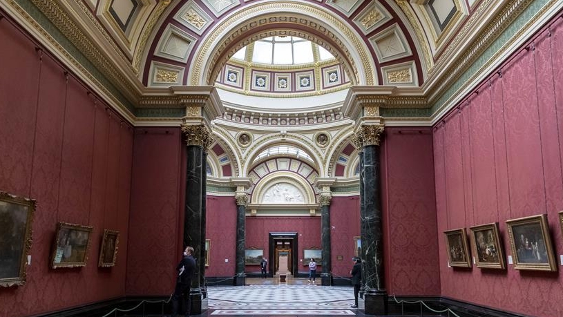 7月4日,參觀者佩戴口罩在英國國家美術館的媒體開放日上參觀。參觀者需提前網(wǎng)上預約參觀時段,全程佩戴口罩且保持安全距離。