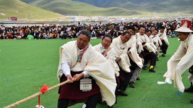 8月10日,“當(dāng)吉仁”賽馬節(jié)活動之一的牧民拔河比賽在西藏拉薩市當(dāng)雄縣舉行。