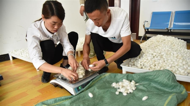 在貴州省畢節(jié)市納雍縣勺窩鎮(zhèn),納雍縣瑞慧桑蠶養(yǎng)殖發(fā)展有限責(zé)任公司工作人員在收購蠶繭。