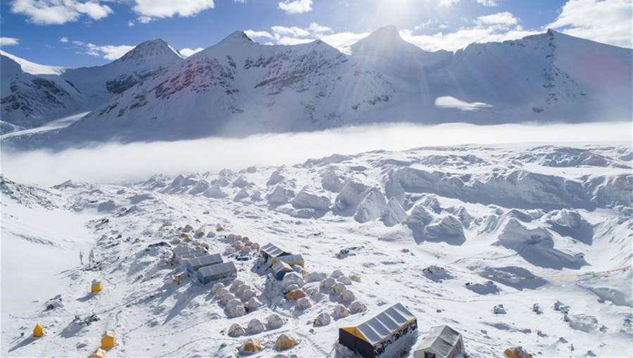 從空中俯瞰珠穆朗瑪峰北坡,生機(jī)勃勃的高原濕地、蜿蜒曲折的盤山公路、壯麗秀美的絨布冰川,還有安靜的村莊和熱鬧的登山營地,共同構(gòu)成一幅壯美畫卷。