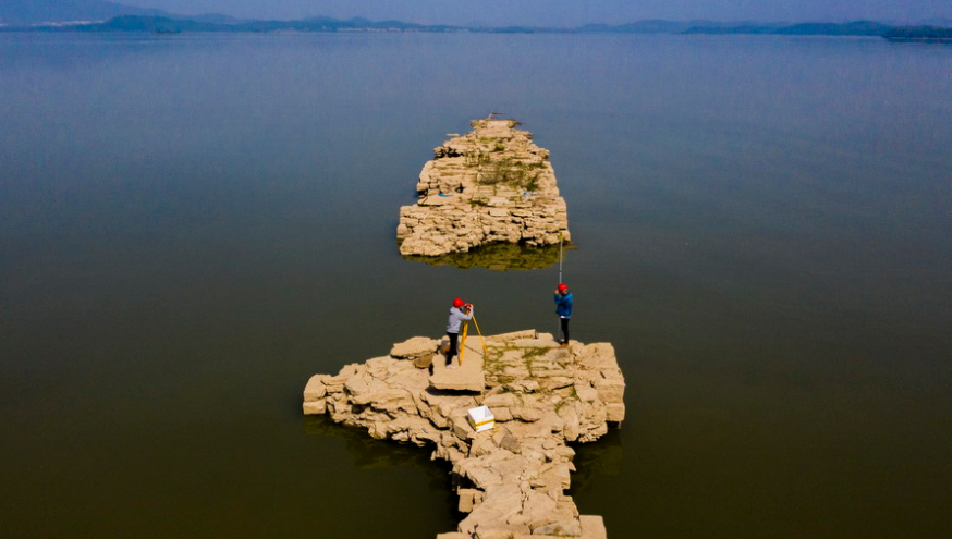 2019年10月30日,江西仙女湖旅游股份有限公司測量人員乘坐工作船對明代萬年橋進行測量,該橋橋身凸出水位最高處達1.64米。
