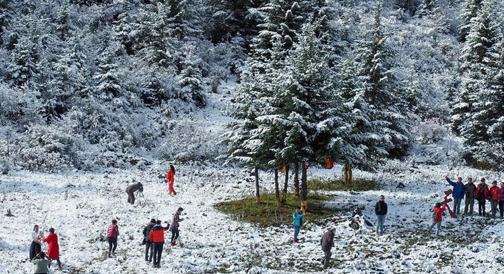 當日,一場夜雪后,川藏線高爾寺山至理塘路段披上了一層銀裝。雪山、牦牛、云朵、松林,帶來了濃濃的雪域風情。