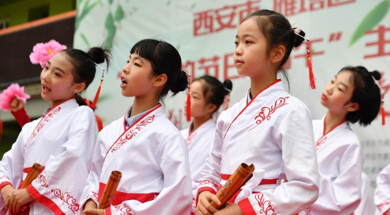 當(dāng)日,陜西師范大學(xué)附屬小學(xué)在位于西安的校園里舉行傳統(tǒng)民俗活動迎接即將到來的端午節(jié)。