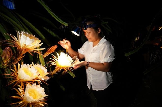 廣西融水:火龍果果農(nóng)夏夜“點花”忙