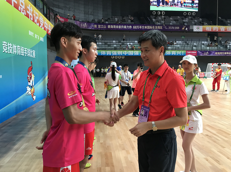 深圳新聞網(wǎng)訊 繼20日結(jié)束的高爾夫球賽奪冠后,深圳代表隊(duì)在廣東省運(yùn)會(huì)再下一金。7月21日,在為期5天的肇慶男子青少年組手球比賽中,深圳手球隊(duì)以35∶29打敗廣州隊(duì)奪得了冠軍,這是深圳男子手球隊(duì)在省運(yùn)會(huì)上獲得的第一個(gè)五連冠,也是深圳代表團(tuán)獲得的第一個(gè)集體項(xiàng)目金牌。深圳文體旅游局副局長(zhǎng)韓星元現(xiàn)場(chǎng)為深圳男子青少年手球隊(duì)頒發(fā)金牌。