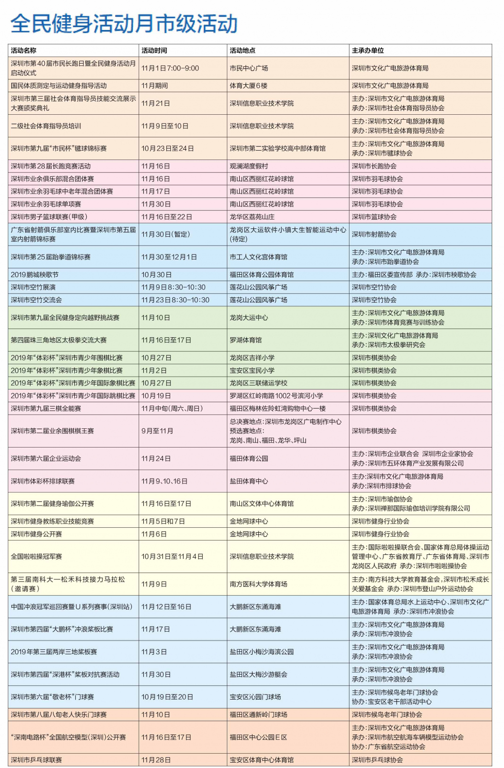 11月期間,深圳將舉辦37場市級活動,內(nèi)容包括跑步、籃球、羽毛球、射箭、跆拳道、秧歌、定向越野賽、太極拳、排球、棋類等比賽以及國民體測與健身指導(dǎo)等系列活動。同時,全市各區(qū)、各單位也因地制宜地將舉辦百余場方便市民參與的全民健身活動,涵蓋項目豐富多彩,最大限度地滿足市民群眾的健身需求。