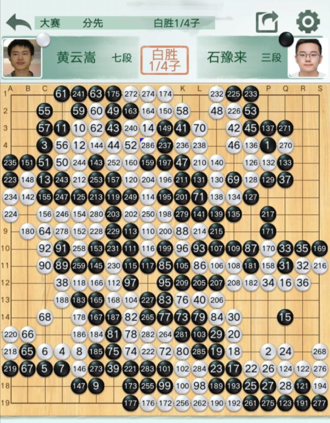 緊接著,連勝柁嘉熹、連笑兩位頂尖九段的石豫來(lái)三段執(zhí)黑對(duì)黃云嵩七段,雙方大戰(zhàn)286手,局面細(xì)膩,勝負(fù)天平一直在左右擺晃,收官時(shí)石豫來(lái)出現(xiàn)了致命的失誤,最終小石以四分之一子惜敗于黃云嵩。