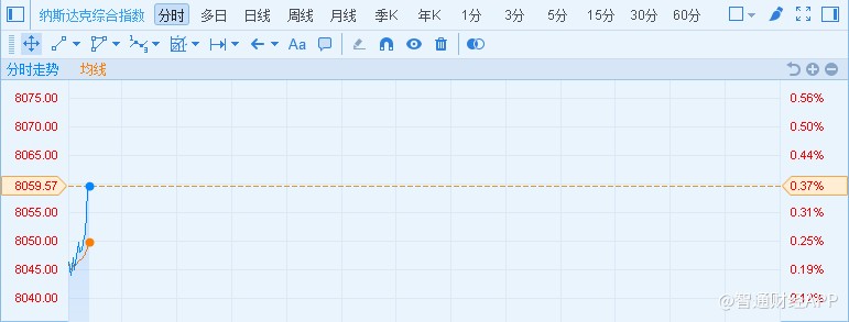 智通財(cái)經(jīng)APP獲悉,周三,美股基本平開(kāi),其中納斯達(dá)克指數(shù)盤(pán)初高走,升穿8046.315點(diǎn),創(chuàng)紀(jì)錄新高。截至發(fā)稿,納指報(bào)8059.57,漲30點(diǎn)或0.37%。