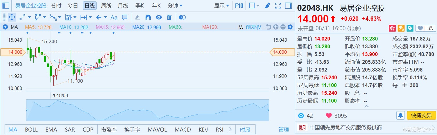 中國(guó)房地產(chǎn)行業(yè)正站在拐點(diǎn)上,行業(yè)集中度將進(jìn)一步提升,存量市場(chǎng)成為各路資本的新戰(zhàn)場(chǎng),“服務(wù)生”易居在資源及戰(zhàn)略布局上已做好充分準(zhǔn)備,上半年的成績(jī)或許只是新的起點(diǎn)。8月31日,易居股價(jià)收漲4.63%,報(bào)14港元。
