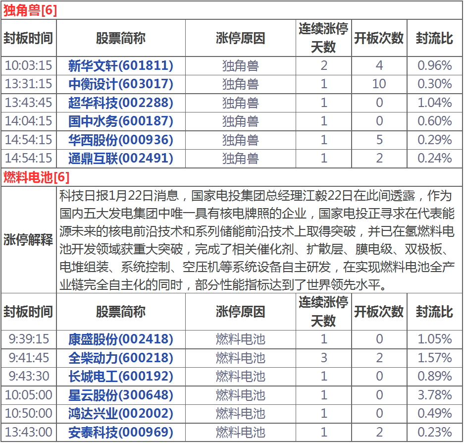 漲停分析:燃料電池再掀炒作獨角獸板塊午后崛起(1月23日)