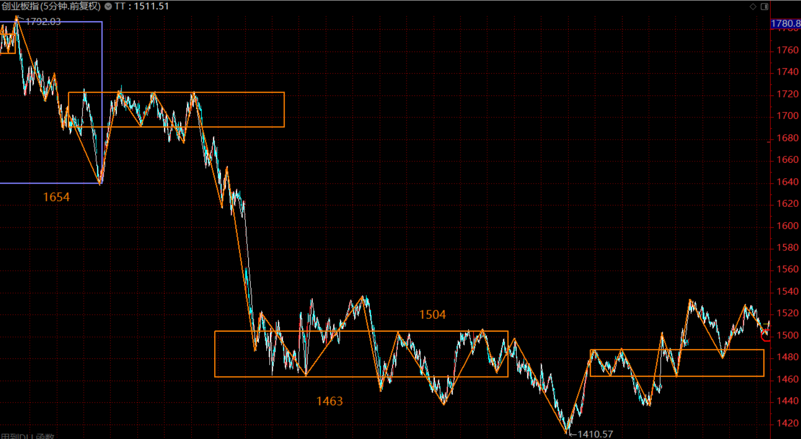創(chuàng)業(yè)板這里未拉離最后一個30分鐘中樞(1463-1504),在中樞上軌附近橫盤,這里做同級別分解后,紅圈圈位置為五分鐘級別的第三類買點。因此,綜合兩個股指,周初市場上漲,后半段需轉入防守,逐步縮減倉位,以應對回調。