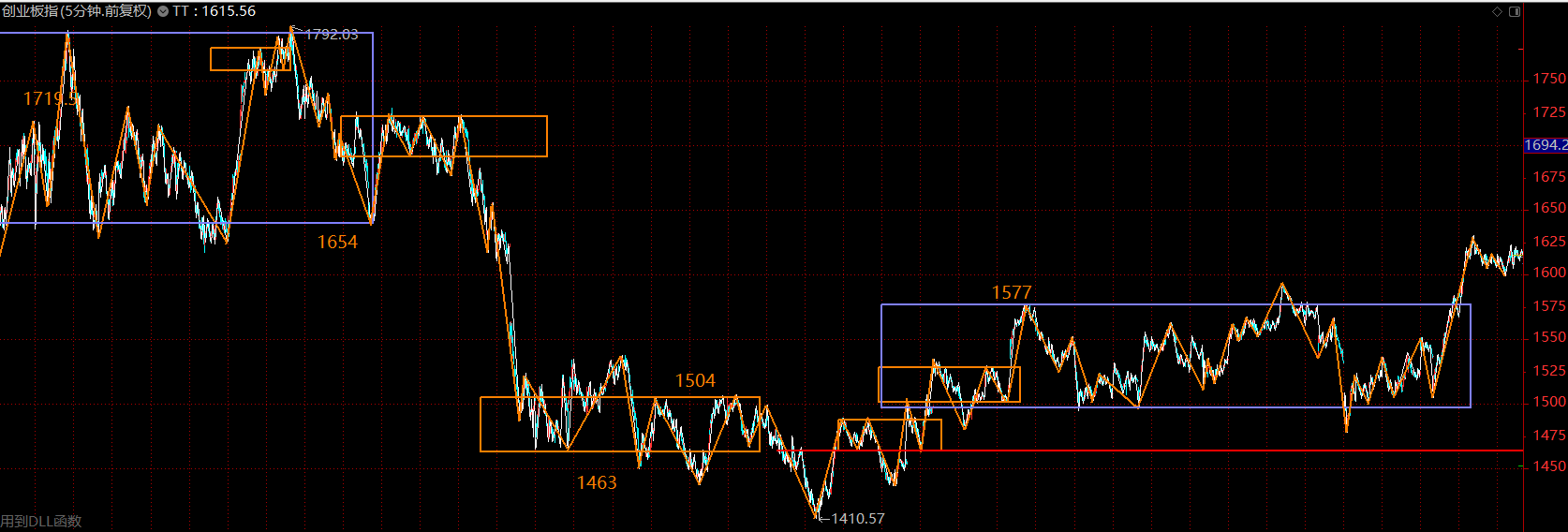 創(chuàng)業(yè)板這里在構(gòu)建30分鐘級別的三買,周一如果不跌破1577點(diǎn),這里將是創(chuàng)業(yè)板主升行情的起點(diǎn)。如若重新跌回中樞內(nèi)部,則按中樞震蕩處理。創(chuàng)業(yè)板走勢要強(qiáng)于主板很多,后續(xù)行情多半仍然圍繞創(chuàng)業(yè)板展開。