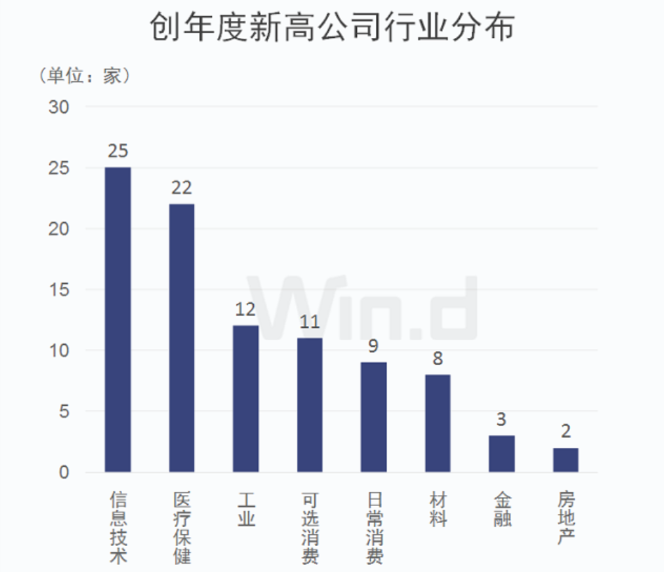 Wind統(tǒng)計顯示,有92家公司近3日最高股價創(chuàng)今年以來新高。從相關公司行業(yè)分布來看,信息技術類最多,有25家;醫(yī)療保健行業(yè)緊隨其后,有22家,工業(yè)、可選消費均有超過10家公司??梢?,科技和生物醫(yī)藥類公司成為牛股聚集地。