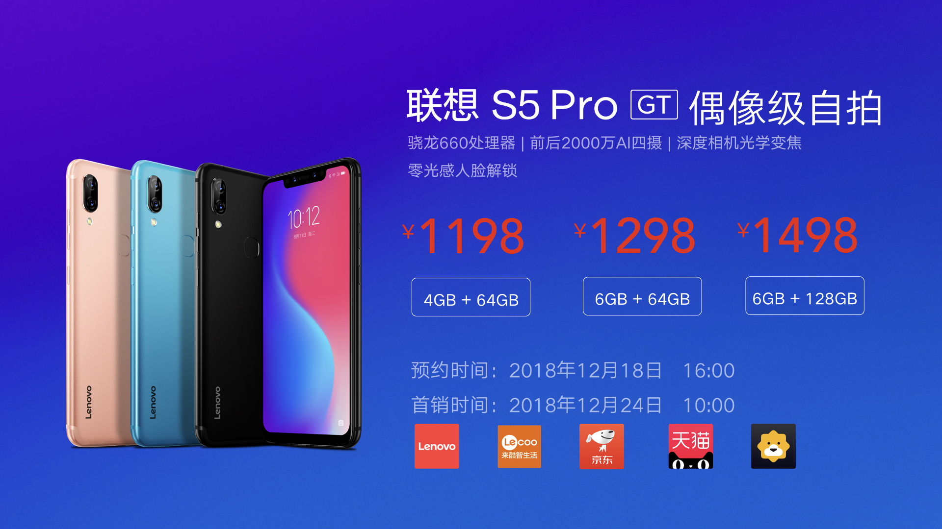 聯(lián)想S5 Pro升級版,配置升級,美麗升級,售價4 G+64G為1198元,6 G+64G為1298元,6 G+128G為1498元。12月18日在全平臺開啟預約,12月24日開啟首銷。