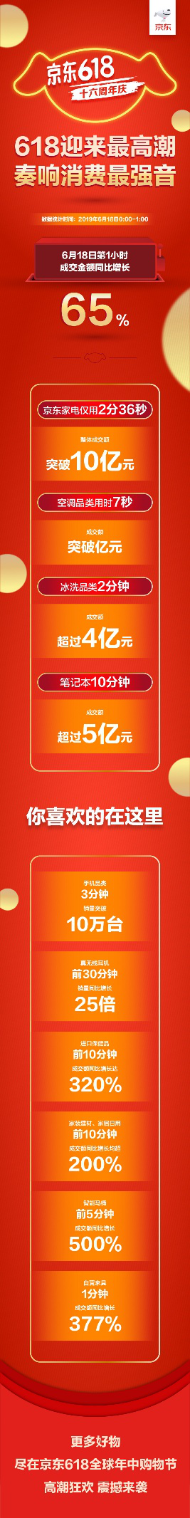 深圳新聞網(wǎng)2019年6月18日訊 6月18日零點(diǎn)的鐘聲猶如一聲清脆的發(fā)令槍,京東618十六周年慶迎來(lái)了18天中的下單最高潮,中國(guó)億萬(wàn)消費(fèi)市場(chǎng)的旺盛活力在這一刻盡情綻放,第一個(gè)小時(shí)的成交金額同比增長(zhǎng)65%,京東在618這場(chǎng)席卷全民消費(fèi)熱潮中的核心地位進(jìn)一步凸顯。