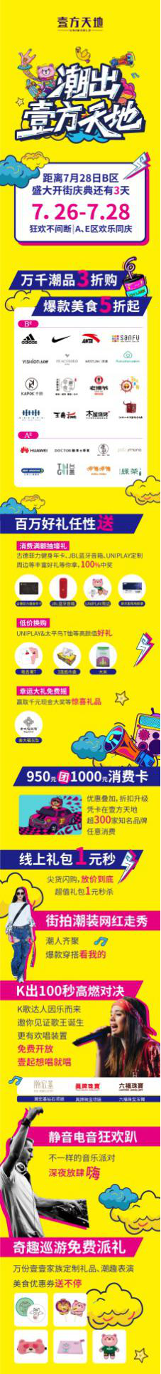 開(kāi)業(yè)期間,精彩紛呈的活動(dòng)當(dāng)然是必不可少的。7.26-7.28開(kāi)業(yè)期間,B區(qū)將聯(lián)動(dòng)A區(qū)、E區(qū)開(kāi)展一系列活動(dòng)。開(kāi)業(yè)活動(dòng)緊扣B區(qū)定位“潮流品味先鋒主場(chǎng)”,充分抓住當(dāng)下年輕人愛(ài)玩、敢玩的特色,將整個(gè)壹方天地變?yōu)槌比ぁ㈧趴岬臍g樂(lè)海洋。