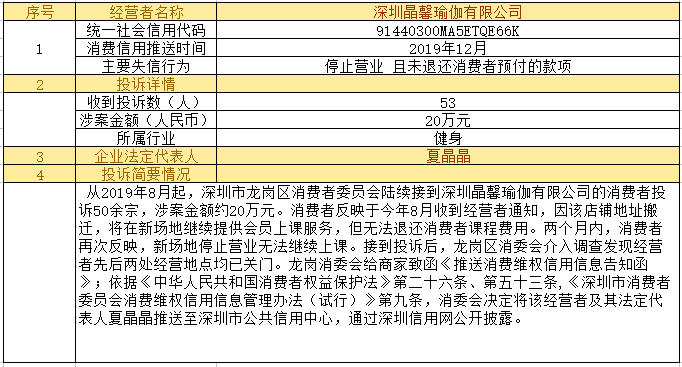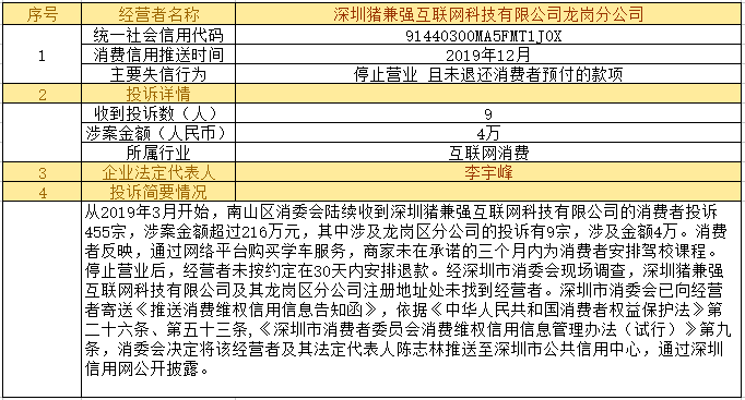 深圳新聞網(wǎng)2019年12月24日訊12月24日,為加強(qiáng)對商品和服務(wù)的社會監(jiān)督,推進(jìn)消費(fèi)領(lǐng)域信用體系建設(shè),深圳市消費(fèi)者委員會(以下簡稱“深圳市消委會”)聯(lián)合福田區(qū)消費(fèi)者委員會(以下簡稱“福田區(qū)消委會”)和龍崗區(qū)消費(fèi)者委員會(以下簡稱“龍崗區(qū)消委會”)將深圳豬兼強(qiáng)互聯(lián)網(wǎng)科技有限公司、深圳市皇域貿(mào)易有限公司、深圳市百家順資產(chǎn)管理有限公司、深圳市予恩美容美發(fā)有限公司、深圳晶馨瑜伽有限公司等五家預(yù)付式和互聯(lián)網(wǎng)消費(fèi)領(lǐng)域停止?fàn)I業(yè)且未退還消費(fèi)者預(yù)付款項(xiàng)的經(jīng)營者及其主要負(fù)責(zé)人推送至深圳市公共信用中心,通過深圳信用網(wǎng)公開披露。