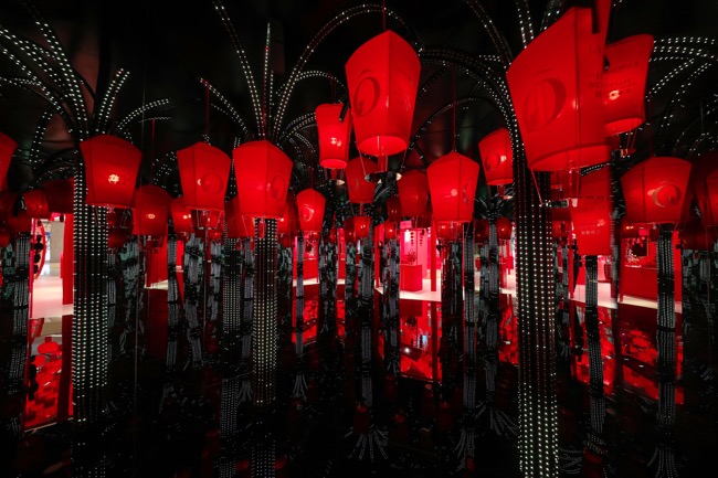 在這奇妙的光影空間,光影由中央向四周擴(kuò)散,循環(huán)往復(fù),好似漫天煙花綻放,絕美絢爛、精彩絕倫。同時(shí)滿載美好祝愿的紅燈籠明暗變化,盡享沉浸式視覺(jué)體驗(yàn)。