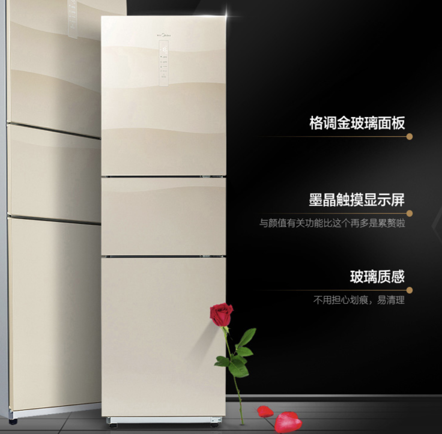 美的這款BCD-239WTGM三開門冰箱,產(chǎn)品采用金色玻璃面板與墨晶顯示屏,杜絕劃痕更有質(zhì)感,寬門設(shè)計、 隱藏暗把手、三溫區(qū)黃金比例。這款產(chǎn)品三溫區(qū)可單獨(dú)控溫,分為121升冷藏室、38升變溫室和80升冷凍室,讓儲鮮多樣化。此外,風(fēng)冷無霜減輕手動除霜的負(fù)擔(dān),保持食物原始口感。