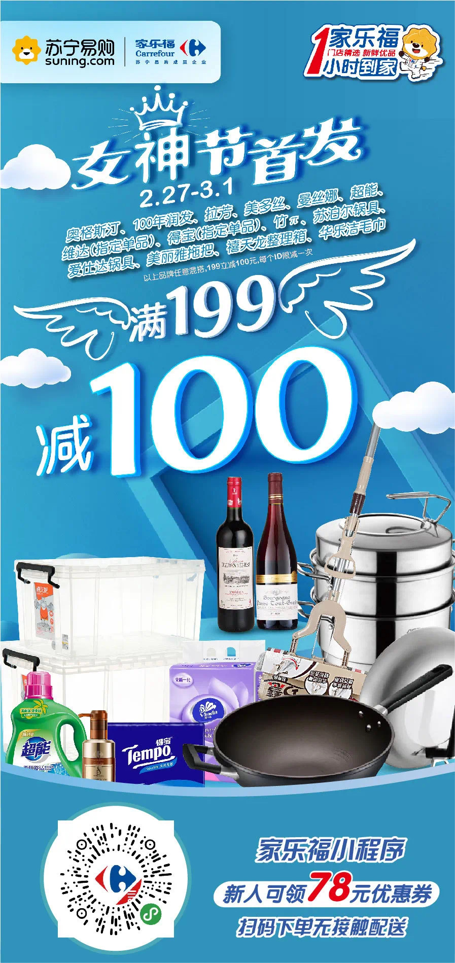 2月27日至3月1日,在家樂福小程序購(gòu)買奧格斯汀、100年潤(rùn)發(fā)、拉芳、美多絲、曼絲娜、超能、維達(dá)(指定單品)、得寶(指定單品)、蘇泊爾鍋具、愛仕達(dá)鍋具、美麗雅拖把等非食品類指定品牌滿199立減100元。