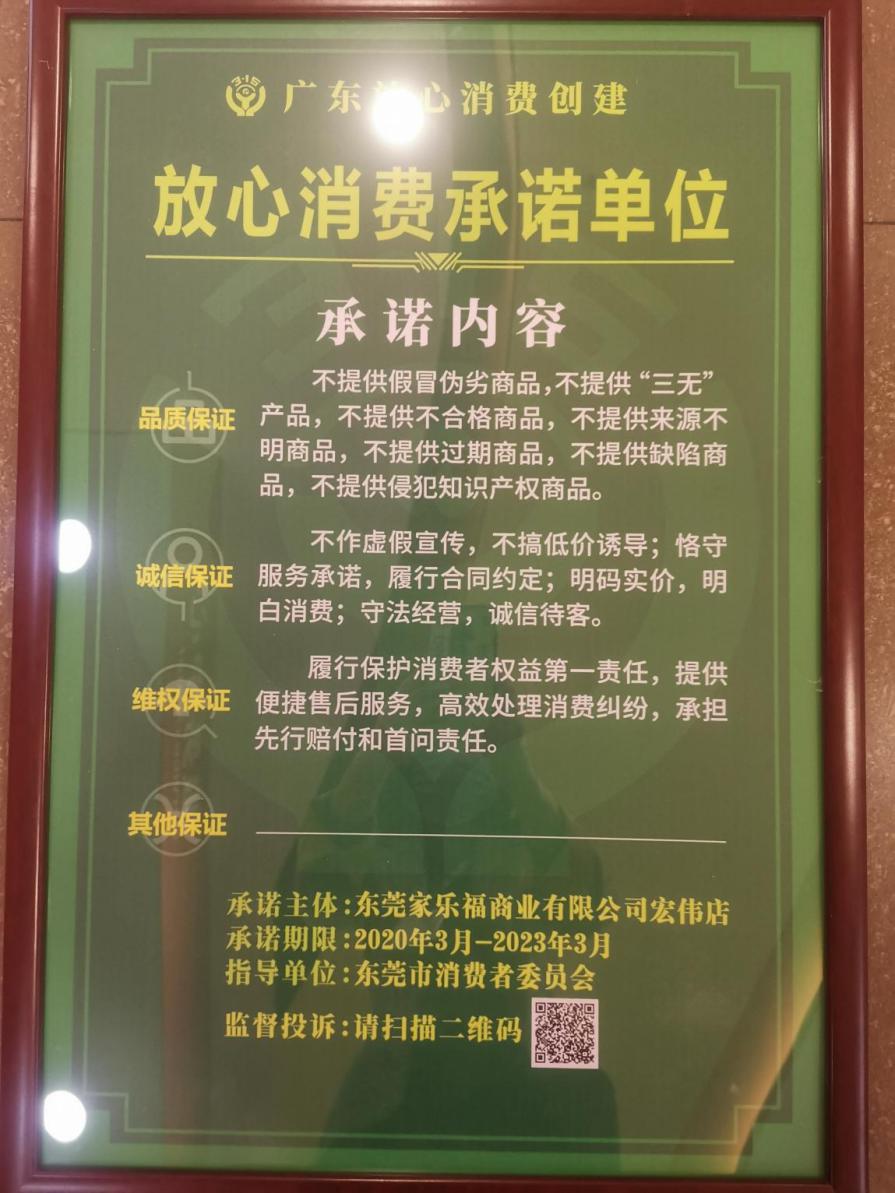 家樂福根據(jù)《經(jīng)營者“放心消費承諾”活動規(guī)則(試行)》向社會公開作出品質(zhì)保證、誠信保證和維權保證的“三大承諾”,承諾不提供假冒偽劣商品,不提供“三無”產(chǎn)品;不作虛假宣傳;履行保護消費者權益第一責任等,充分發(fā)揮放心消費承諾單位示范作用,深入推進放心消費創(chuàng)建活動,深化消費維權社會協(xié)同共治,營造安全放心的消費環(huán)境。