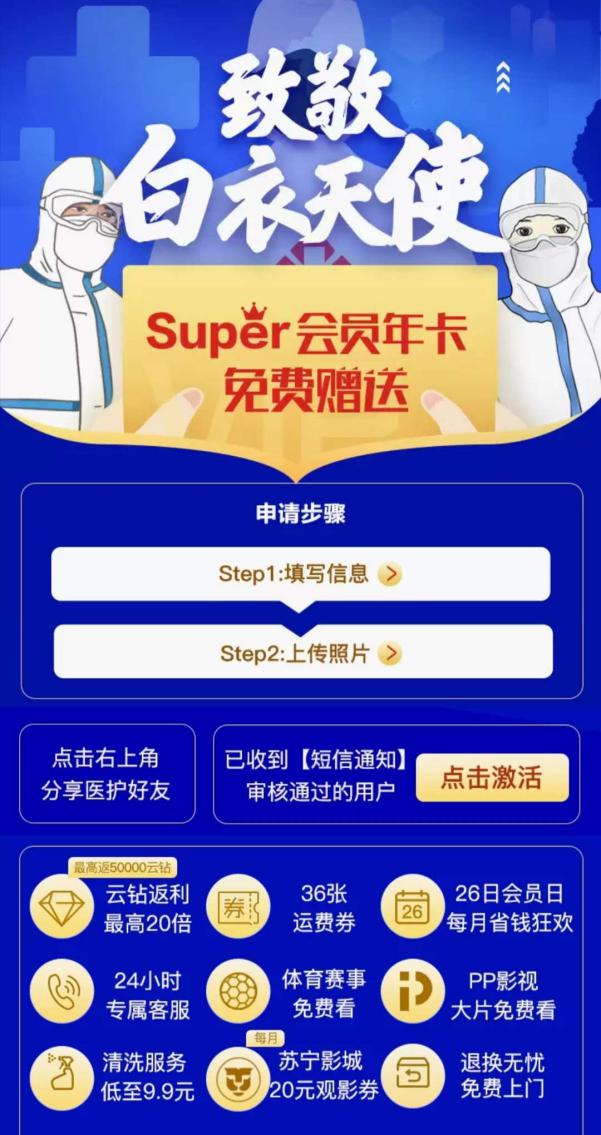 見(jiàn)圳客戶(hù)端·深圳新聞網(wǎng)2020年4月7日訊 自從3月27日蘇寧易購(gòu)為醫(yī)護(hù)人員開(kāi)放Super會(huì)員免費(fèi)申領(lǐng)活動(dòng)起,引發(fā)全國(guó)醫(yī)務(wù)工作者關(guān)注。數(shù)據(jù)顯示,3月27日-4月2日,活動(dòng)線上申請(qǐng)人數(shù)日均增長(zhǎng)59%。尤其在蘇寧易購(gòu)宣布擴(kuò)大贈(zèng)送范圍之后,藥師申請(qǐng)人數(shù)日均增長(zhǎng)達(dá)89%,技師申請(qǐng)人數(shù)日均增長(zhǎng)達(dá)145%,包括公共衛(wèi)生醫(yī)師、感染管理、心理治療師、醫(yī)院信息科工程師、救護(hù)車(chē)駕駛員等,也紛紛遞交了申請(qǐng)。