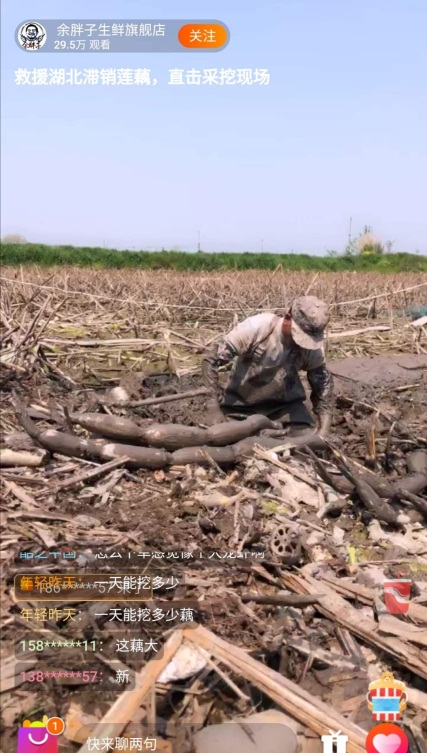 除了湖北的縣長、市長外,普通的湖北商戶不甘落后。8日上午,荊州洪湖的陽光明媚,“余胖子生鮮旗艦店”的店主便打開手機(jī)接通了直播,樸實(shí)的農(nóng)民性格讓他面對鏡頭一時(shí)不知該說什么好,簡單問好后,他就轉(zhuǎn)身下了塘,開始從厚重的泥土里拔出一根根新鮮的蓮藕。有不少00后網(wǎng)友是第一次見到挖藕的過程,他們發(fā)現(xiàn)原來潔白爽口的大藕居然是從泥中挖出來的,“挖藕真的太不容易了,一個(gè)上午要泡在塘泥里。”