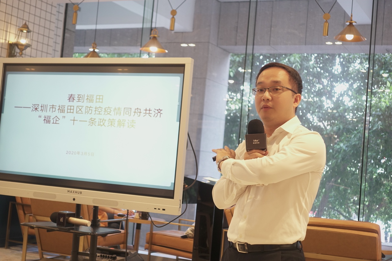 深圳市福田區(qū)財政局副局長林俊駒在分享會上指出,作為深圳最早研究提出企業(yè)復工復產的政府部門,深圳市福田區(qū)財政局第一時間啟動了應急資金撥付機制和應急政府采購機制,并快速印發(fā)工作指引,加強對各預算單位的業(yè)務指導,以及對各單位和各區(qū)資金撥付的保障。據不完全統計,在疫情發(fā)生以來,深圳市福田區(qū)政府共投入4億多元疫情防控物資購置及醫(yī)療救治經費等方面。在此次分享會上,面向入駐在BEEPLUS深圳財富大廈空間的企業(yè)會員,林俊駒副局長為與會企業(yè)解讀了福田區(qū)“福企”11條及新“福企”10條政策,強調區(qū)政府又另行投入10億支持福田區(qū)企業(yè)克疫前行。他表示,在未來,福田區(qū)政府將繼續(xù)為創(chuàng)新創(chuàng)業(yè)類企業(yè)提供強有力的政策支撐,加大支持力度。