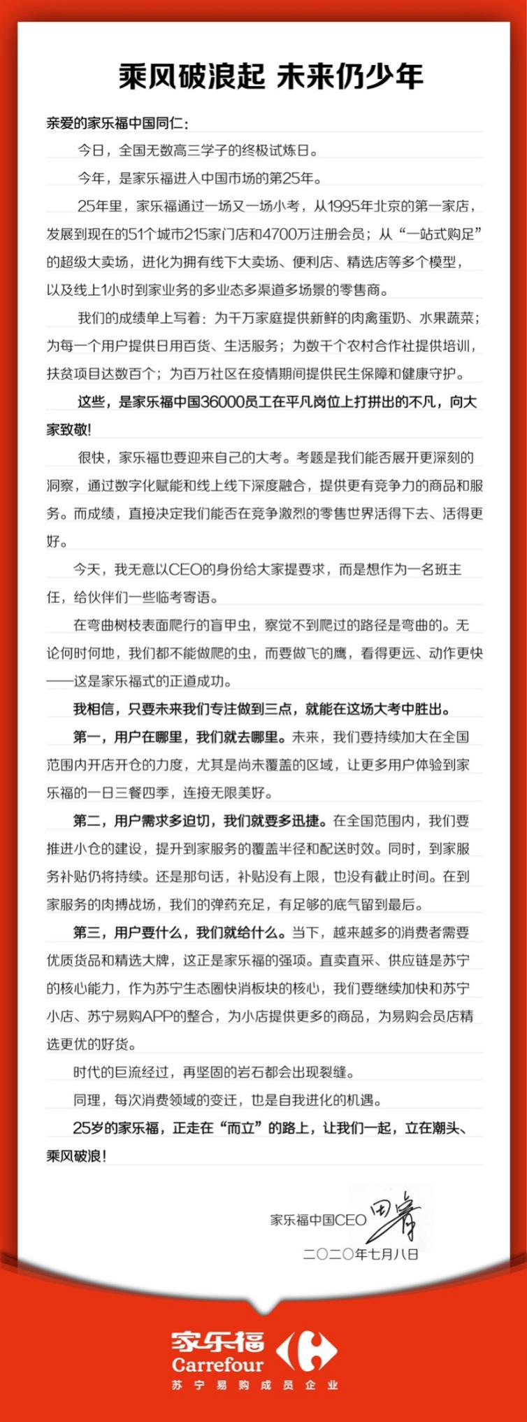 見圳客戶端·深圳新聞網(wǎng)2020年7月9日訊 今年,是家樂福進(jìn)入中國(guó)市場(chǎng)的第25個(gè)年頭。昨日,蘇寧家樂福CEO田睿發(fā)出內(nèi)部郵件,表示家樂?!盁o(wú)論何時(shí)何地,都不能做爬的蟲,而要做飛的鷹”,將持續(xù)加大在全國(guó)范圍內(nèi)開店開倉(cāng)的力度,并通過小倉(cāng)建設(shè)和補(bǔ)貼,提升到家服務(wù)的覆蓋半徑和配送時(shí)效。