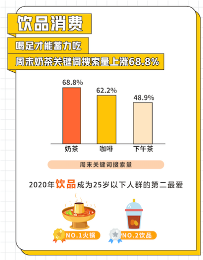 周末餐飲消費(fèi)中,在美團(tuán)點(diǎn)評(píng),周末奶茶、咖啡關(guān)鍵詞搜索量上漲均超過(guò)60%,飲品更是成為25歲以下人群除火鍋之外的“心頭好”。