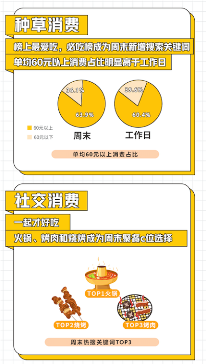 跟著榜單種草、拔草的“種草消費(fèi)”成為周末消費(fèi)的重要特點(diǎn)之一。美團(tuán)6-7月數(shù)據(jù)顯示,“必吃榜”成為周末新增熱搜關(guān)鍵詞,且6-7月周末單均60元以上消費(fèi)占比達(dá)63.9%,明顯高于工作日的60.4%。