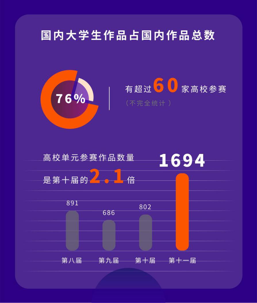 作為參與金鵬短片導(dǎo)演扶持計(jì)劃的重要力量,今年高校大學(xué)生的參賽積極性持續(xù)高漲。本屆短片節(jié)發(fā)起的“全國大學(xué)生視頻創(chuàng)意大賽”共收到來自全國超過60所高校的1694部參賽作品,數(shù)量同比增長一倍。國內(nèi)大學(xué)生參賽作品數(shù)量在所有國內(nèi)參賽作品總數(shù)中占比58%,大學(xué)生創(chuàng)作者一躍成為金鵬短片導(dǎo)演扶持計(jì)劃的中堅(jiān)力量,凸顯了新時(shí)代下年輕創(chuàng)作者對短片以及短視頻的無限熱情和興趣執(zhí)著。大學(xué)生競賽單元將分別評選出“最佳大學(xué)生短片”、“最佳大學(xué)生劇情短片”、“最佳大學(xué)生紀(jì)錄短片”、“最佳大學(xué)生動(dòng)畫短片”、“最佳大學(xué)生VLOG短片”、“最佳大學(xué)生科普短片”、“最佳大學(xué)生廣告創(chuàng)意短片”、“最佳大學(xué)生原創(chuàng)音樂短片”等9大類型入圍優(yōu)秀作品。