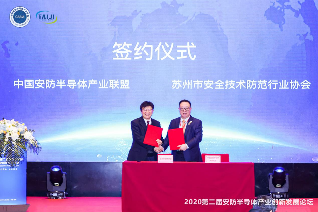 中國安防半導(dǎo)體產(chǎn)業(yè)聯(lián)盟主席楊金才和蘇州市安全技術(shù)防范行業(yè)協(xié)會(huì)秘書長王坤泉現(xiàn)場進(jìn)行簽約
