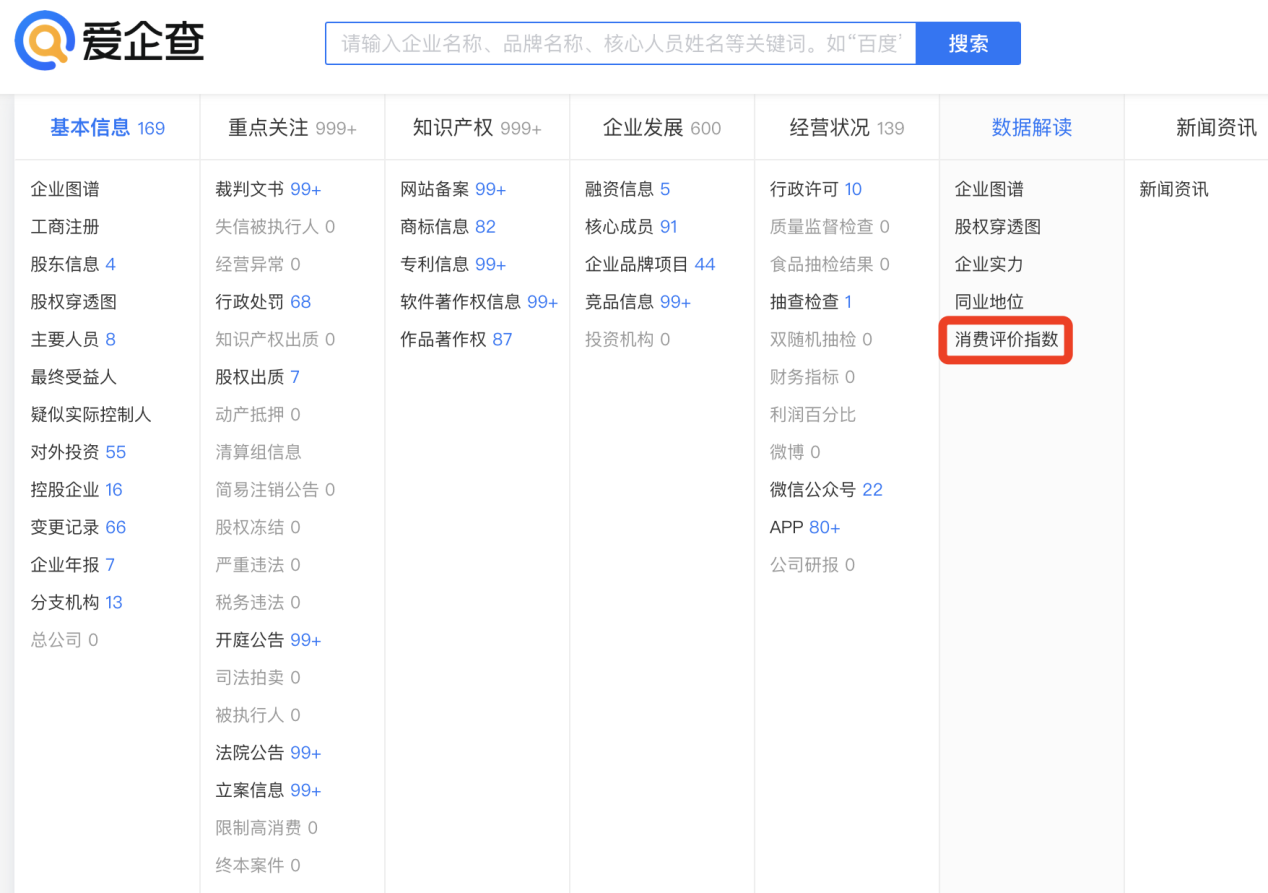 “愛企查”企業(yè)消費(fèi)評價指數(shù)查詢流程: