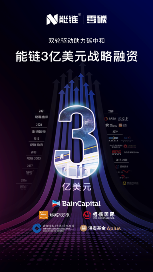 中國(guó)網(wǎng)2020年3月23日訊 昨日,能鏈宣布完成新一輪2億美元戰(zhàn)略融資,貝恩資本(Bain Capital)領(lǐng)投,老股東愉悅資本繼續(xù)跟投,華興資本擔(dān)任獨(dú)家財(cái)務(wù)顧問(wèn)。綜合今年年初招銀國(guó)際領(lǐng)投的1億美元融資,能鏈本次戰(zhàn)略輪系列融資累計(jì)金額達(dá)3億美元。能鏈股東還包括中金資本、洪泰基金旗下國(guó)調(diào)洪泰、中小企業(yè)發(fā)展基金、小米集團(tuán)、蔚來(lái)資本、KIP中國(guó)等。