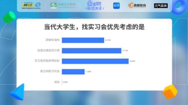 大家在尋找實習(xí)的過程中,會優(yōu)先考慮的三個因素分別是實習(xí)是否能獲得經(jīng)驗、住宿交通是否方便、薪酬和福利。